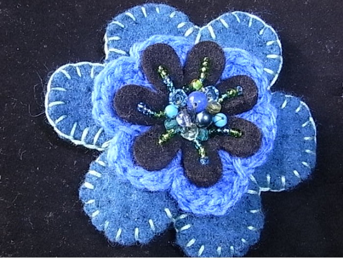 The Blue outer petals are felted wool and the felt flower is made from 100% recycled wool and is embroidered by hand. The centre is hand beaded in blue and green beads. The corsage has a brooch and pin fitting at the back that can be attached on a garment or clipped in the hair.